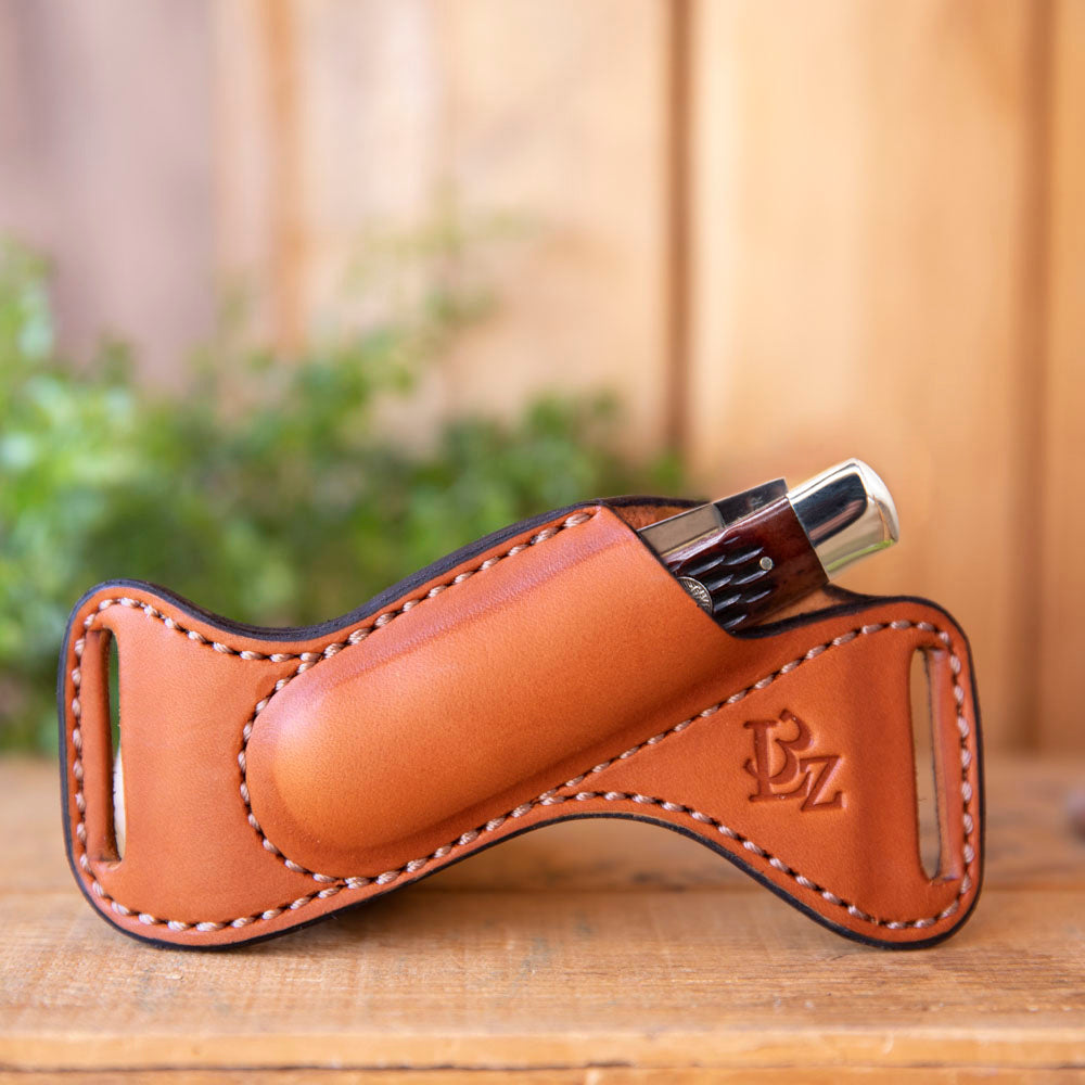 Made of chestnut, or natural English Bridle leather with 1.5" belt loops, this wet molded sheath securely holds your black or brown jig bone k.n.i.f.e.