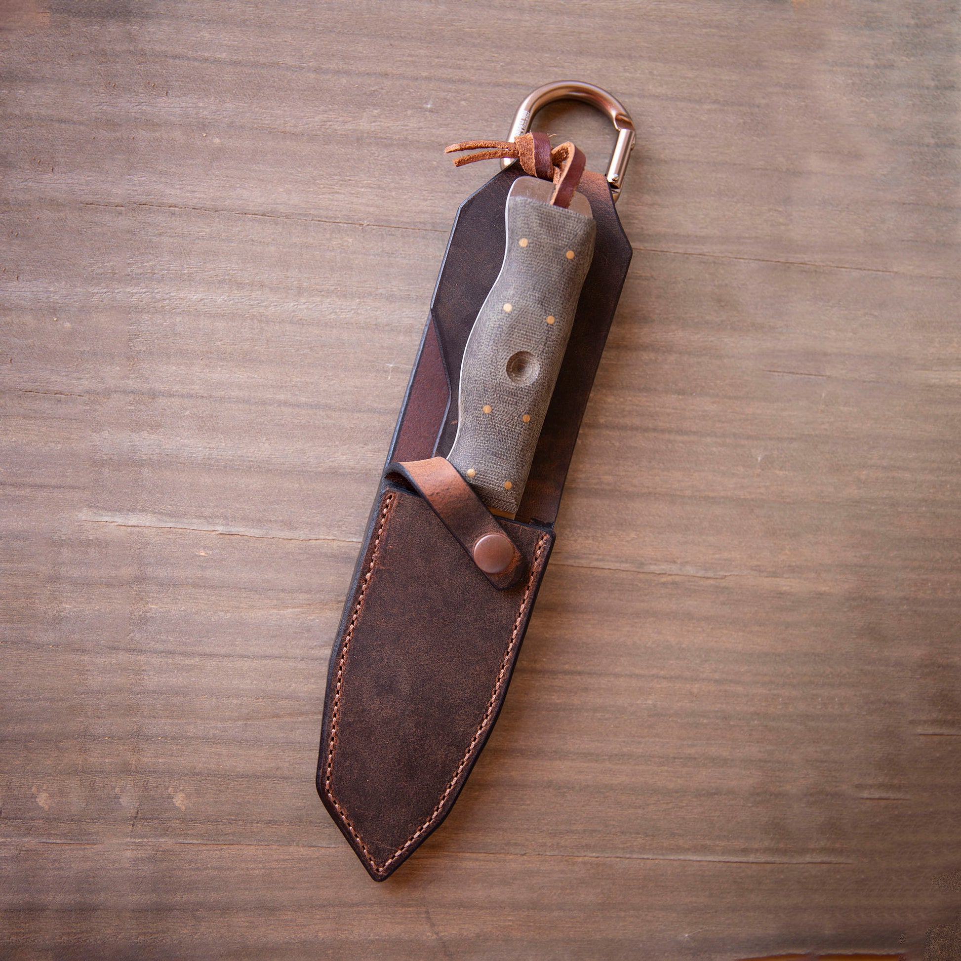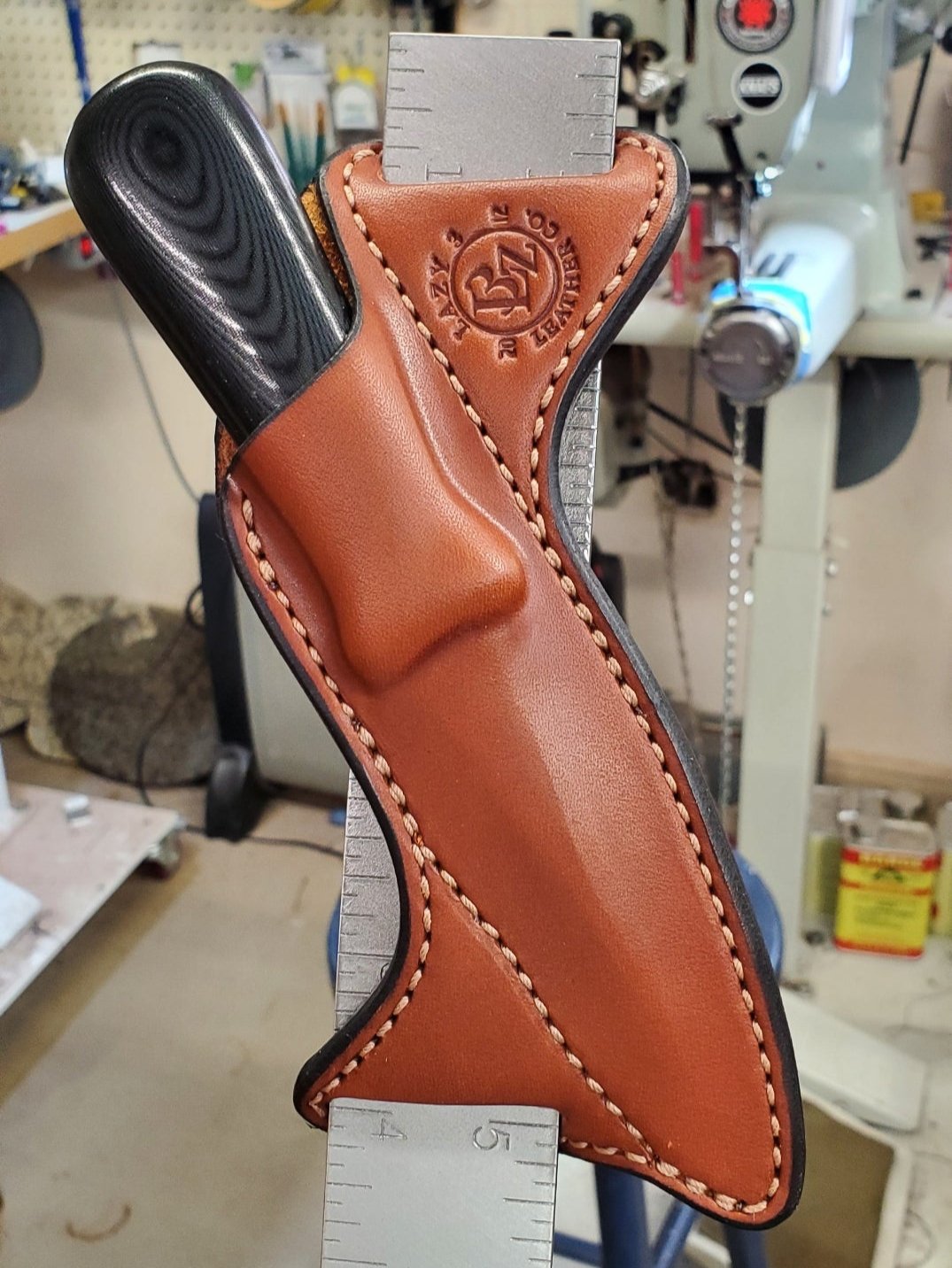 As the title states, my knife was living its life inside a protective pouch. Lazy 3 worked with my requests, and made a beautiful and functional sheath. Now it's traveling with me instead of being left behind.