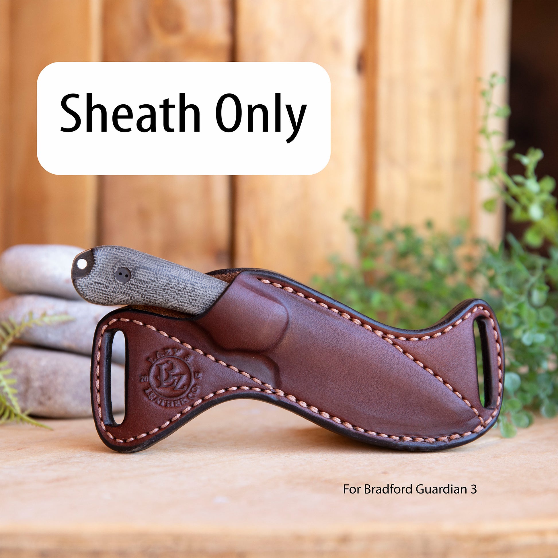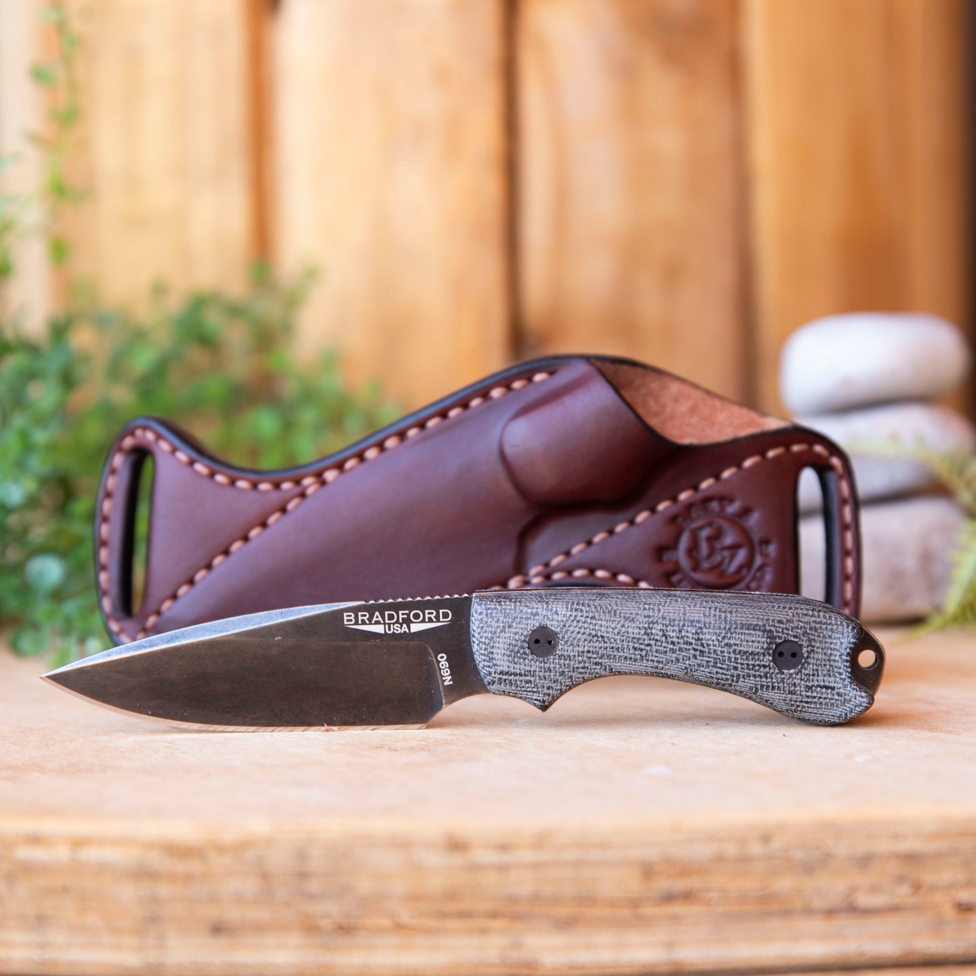The Bishop Scout Carry Sheath is the perfect everyday carry companion for your Bradford Guardian 3. This sheath has been wet molded to fit the Guradian 3 with smooth Micarta scales. Our leather sheaths are made from full grain English Bridle leather from Wickett and Craig, and they provides great retention to keep your blade safe. The Bishop scout carry is a horizontal carry style sheath that is worn on a 1.5" wide belt. All our sheaths are handcrafted in shop in Ivins, Utah with top quality materials from the USA. This sheath is a must-have for any outdoor enthusiast.